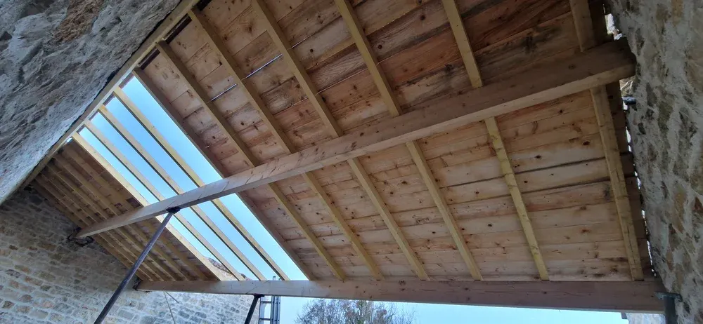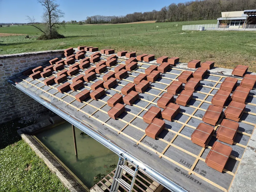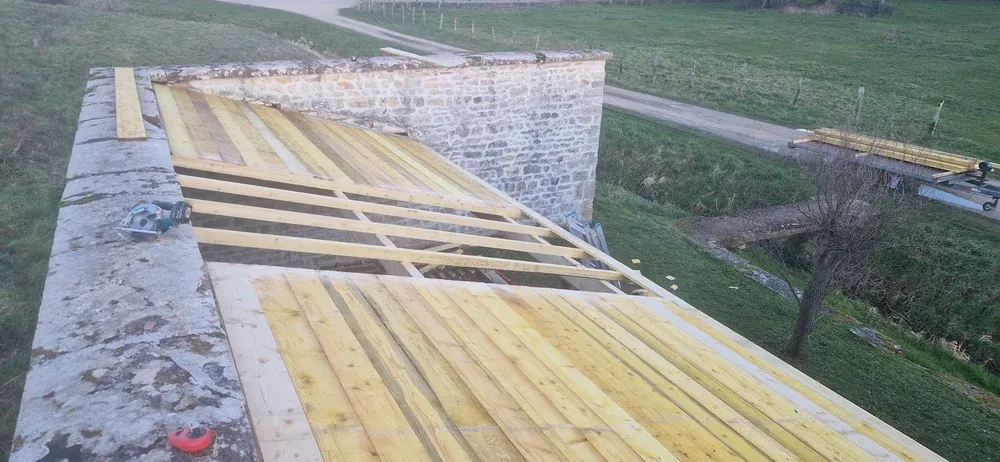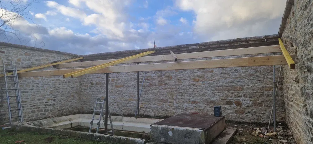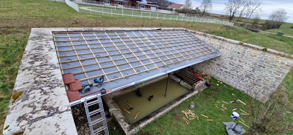 Chez Richard Bois & Toit, nous sommes fiers de partager notre dernière réalisation : la rénovation d'un toit monopant pour le lavoir de Damartin-Marpin. Ce projet a nécessité un changement complet de la structure, incluant la pose de nouveaux chevrons et l'installation d'une volige rabotée pour le support de couverture. Enfin, nous avons opté pour une couverture en tuile mécanique sur une surface de 10 m², garantissant à la fois esthétisme et durabilité.