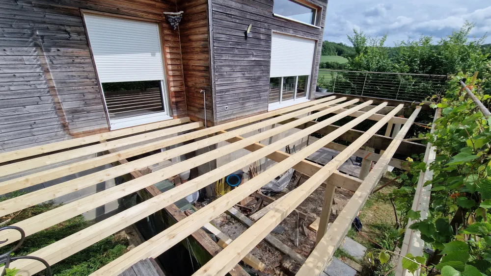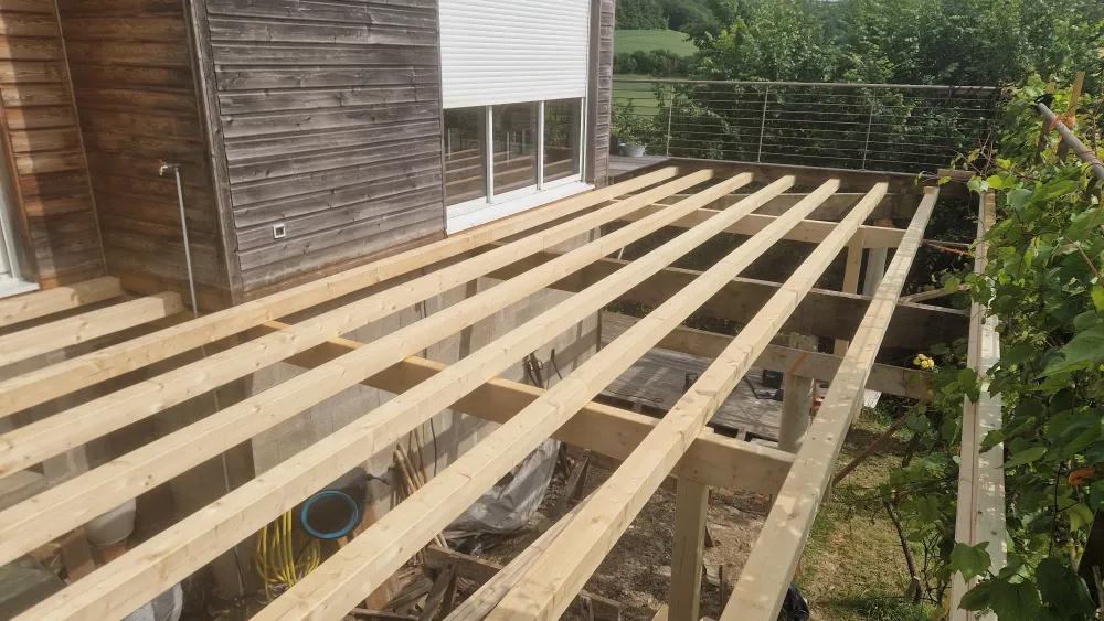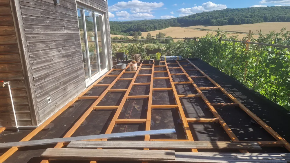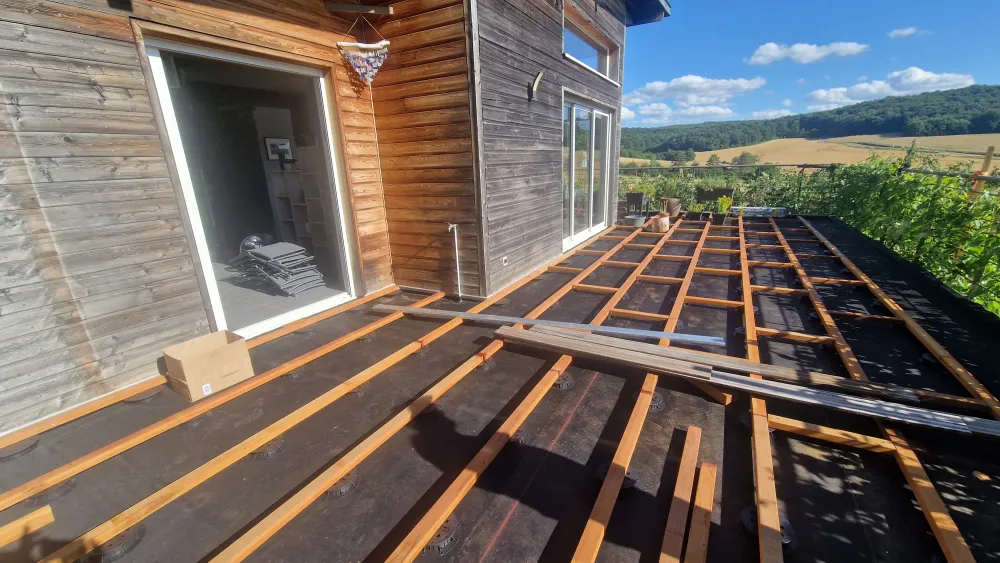 Démontage d'une structure de terrasse, pour mettre en place une nouvelle structure avec plancher, étanchéité, pour nouvelle terrasse